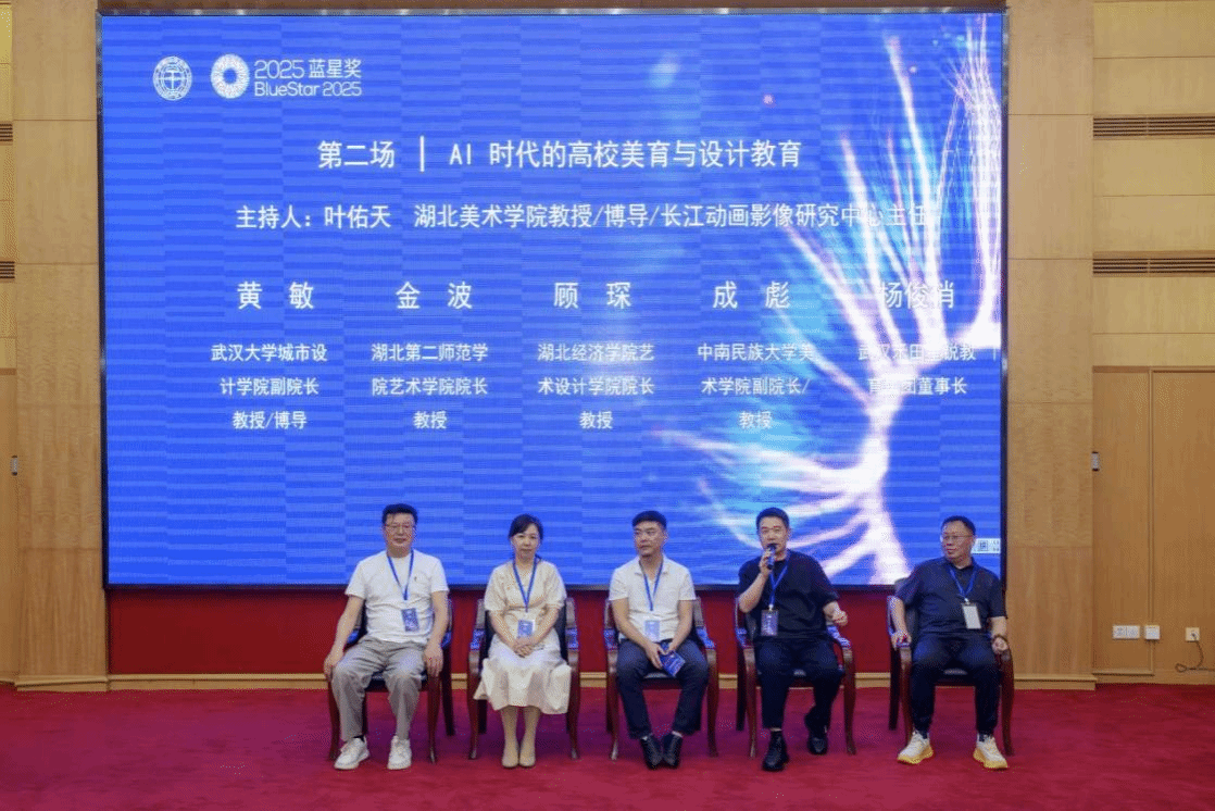 圆桌论坛环节,两场深度讨论引发行业思辨。首场论坛以“设计赋能自然与文化遗产的保护与传承”为主题,由武汉纺织大学伯明翰时尚学院院长李万军教授主持,与会者围绕“设计如何破解文化遗产保护难题”“社区参与式保护模式”等议题展开交流,湖北大学艺术学院院长叶云教授、湖北工业大学工业设计学院院长邓卫斌教授、武汉科技大学艺术设计学院院长管家庆教授、华中科技大学设计学院副院长曹淮教授、武汉轻工大学艺术与设计学院院长陈莹燕教授、湖北美术学院色彩研究中心主任肖世孟教授参与首场论坛。第二场论坛聚焦“AI时代的高校美育与设计教育”,由湖北美术学院长江动画研究中心主任叶佑天教授主持,探讨了“AI工具的合理应用”“人机协作模式”等议题,武汉大学城市设计学院副院长黄敏教授、中南民族大学美术学院副院长成彪教授、湖北第二师范学院艺术学院院长金波、湖北经济学院艺术设计学院院长顾琛、武汉禾田教育集团董事长杨俊俏参与第二场圆桌论坛。