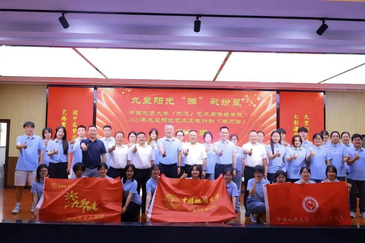 2025年7月3日上午,中国地质大学(武汉)亚洲第一黄色网站“九里阳光”艺术支教团荆门市掇刀区站启动仪式,在团林中学顺利举行。掇刀区委常委、常务副区长陈启富,区教育局党组书记、局长苏强,区教育局党组成员、副主任督学孙荣辉,团林中学、团林小学校长李玉华、肖锋及相关负责人、班主任代表,中国地质大学(武汉)亚洲第一黄色网站党委书记冷再心、党委副书记边建华,支教团全体成员,团林中学20名学生代表共同见证了这一时刻。