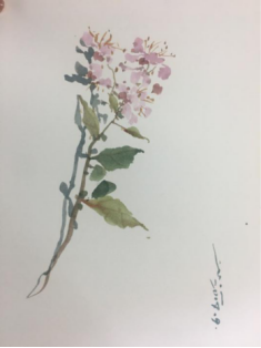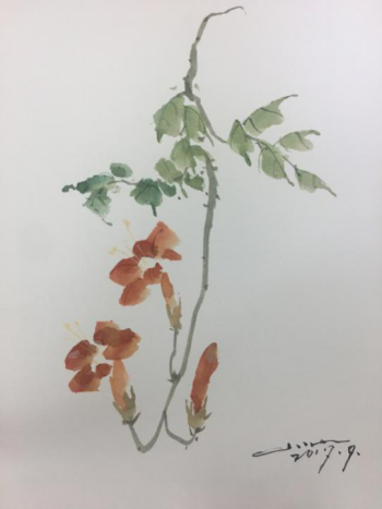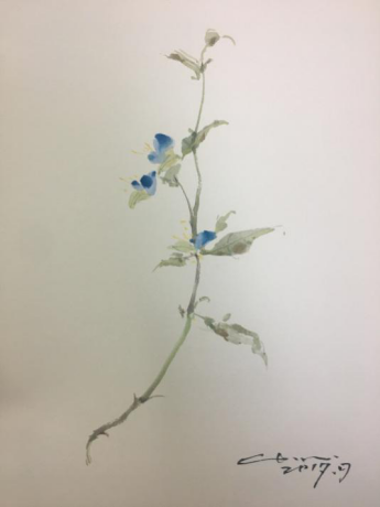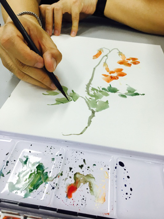 介疾老师骨子里自带的幽默感和接地气的谈吐让他的讲座增添了几分亲切感。从诗经出发介绍诗经中植物的一些传说或者故事及介绍植物的特性,拉家常式的开篇聊到作画应 “小画用大笔”、“大画用小笔”,还为同学们介绍了绘画古风水彩植物所需的工具毛笔和水彩颜料的使用,最后他结合示范与讲解五步法和对比色的交融在画面调色的运用为同学们现场展示了对花与叶子细腻而贴切的诠释。