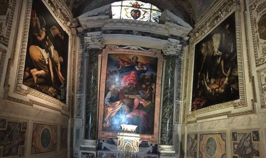下午,老师决定带写生小组感受一下罗马的古代建筑与卡拉瓦乔的绘画作品。从酒店出来不远处就是地铁站,乘坐地铁到圣母堂附近,参观卡拉瓦乔的《圣彼得上十字架》以及《圣保罗之光》。卡拉瓦乔讲究画面的单一光源与深色背景互相烘托,营造强烈的光感以及深沉的气氛。这种具有戏剧感和真实感的绘画形式如同一柄利剑划破天空,为欧洲油画带来了巨大的震撼与启发。接着,实习小组继续步行到圣奥古斯丁教堂,这里存放着卡拉瓦乔《洛莱托的圣母》。图中圣母抱着小耶稣接受朝拜,画面光线明暗感强烈,人物的神态动作逼真自然,仿佛不在画中,而在眼前。最后一幅画是位于圣王路易教堂的《圣马太蒙召》,一束天光由右侧打来,辛苦一年突然蒙受耶稣召唤的圣马太面容充满了惊喜与激动,而在一旁忙着清点辛苦工作所得报酬的劳工,却没注意到耶稣亲临。由画面传达的这种身临其境的真实感,令同学们久久回味,不愿离去。