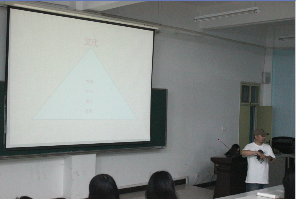 首先,郑老师对艺术给出了自己的定义,“艺术是用形象来反映现实,比现实更加典型的社会意识形态。艺术是开放的,艺术家毋需知道何为艺术,只需创作艺术。”同时,郑老师提到艺术与文化紧密相联,并从哲学、艺术、设计、技术四个方面,阐释了文化与艺术间的相互影响。