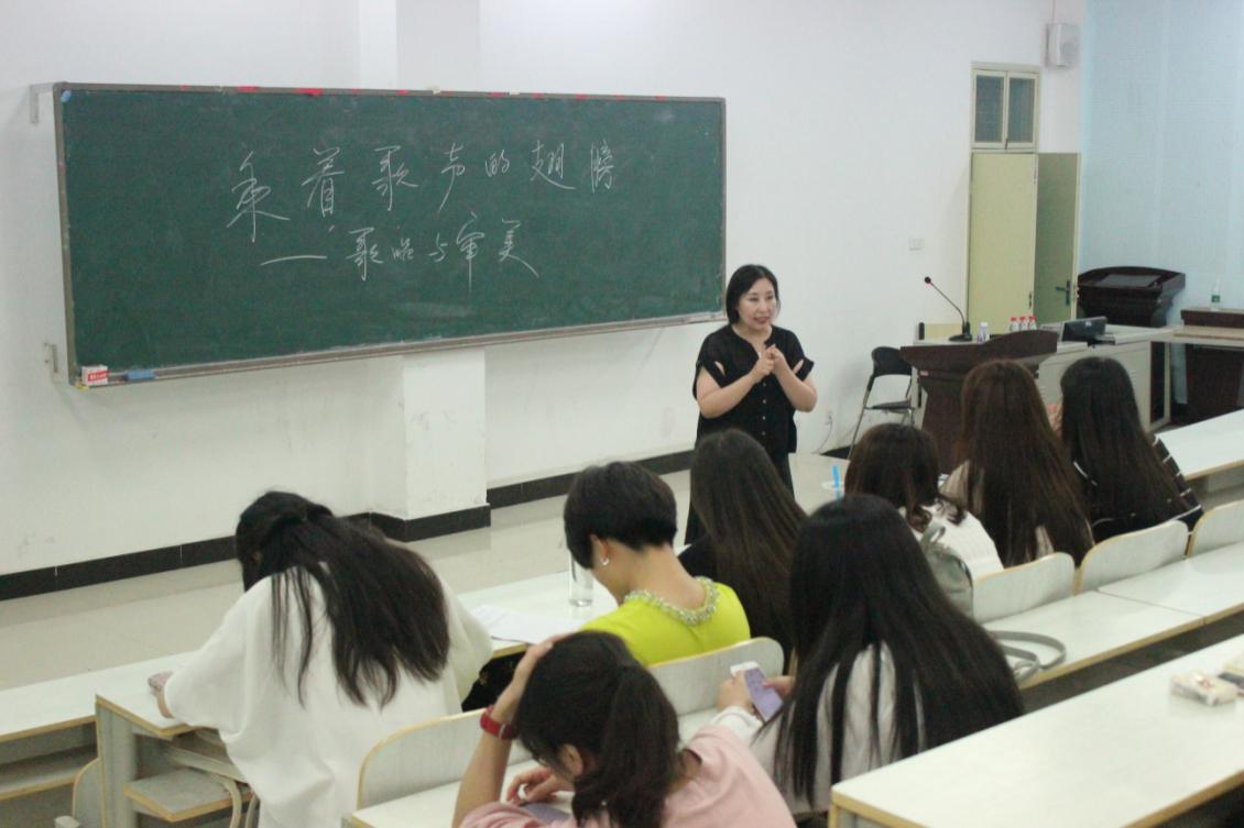 接着,张老师强调艺术是相通的,就如音乐是流动的建筑,同时也是凝固的建筑所言。音乐具有综合性,比如当前流行的音乐剧就是戏剧、舞蹈、音乐、服饰和色彩的综合,正因为这样的综合性,让音乐渗透到生活的方方面面。同时,张老师也用生动形象的语言向同学们剖析了音乐的本质:歌词是音乐的实体、旋律是灵魂、节奏是骨架、乐器则是血肉。