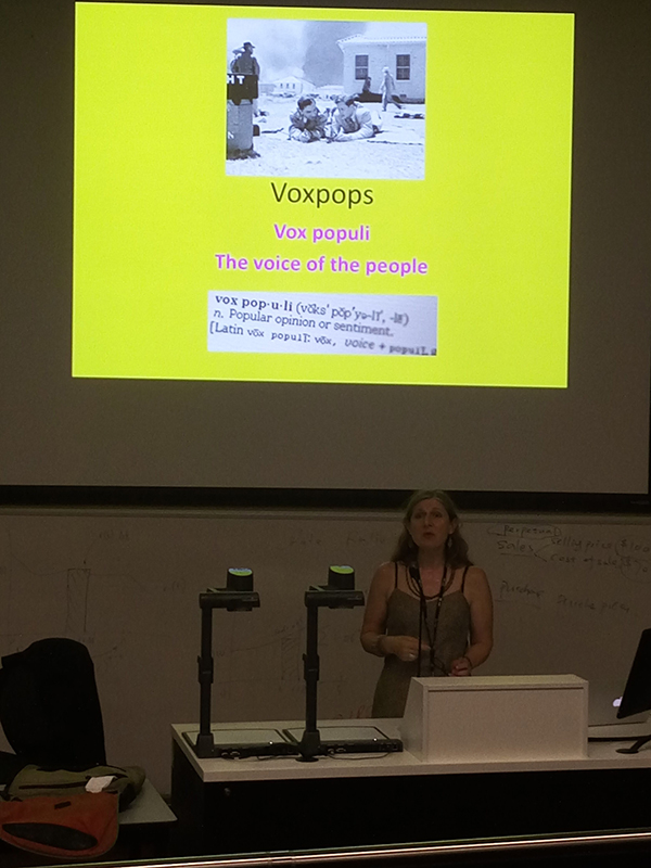 今早9:00在MacquarieUniversity的W5A教学楼T2教室里我们聆听了一场与RadioProduction有关的讲座。在为期近1个小时的讲座中,professorMadsen用近40分钟的时间来切入主题。这次的主题是Voxpops(图1),为了让学生更好的理解Voxpops这种采访方式,教授从BBC上下载了几段采访片段让学生聆听(图2),然后进行提问,询问学生们对这种采访方式有怎样的感想。从对学生问题的总结分析(图3),慢慢切入主题。最后再用近20分钟展示本次讲座的主要内容,并提出对于这种采访方式需要注意的部分内容(图4)。
