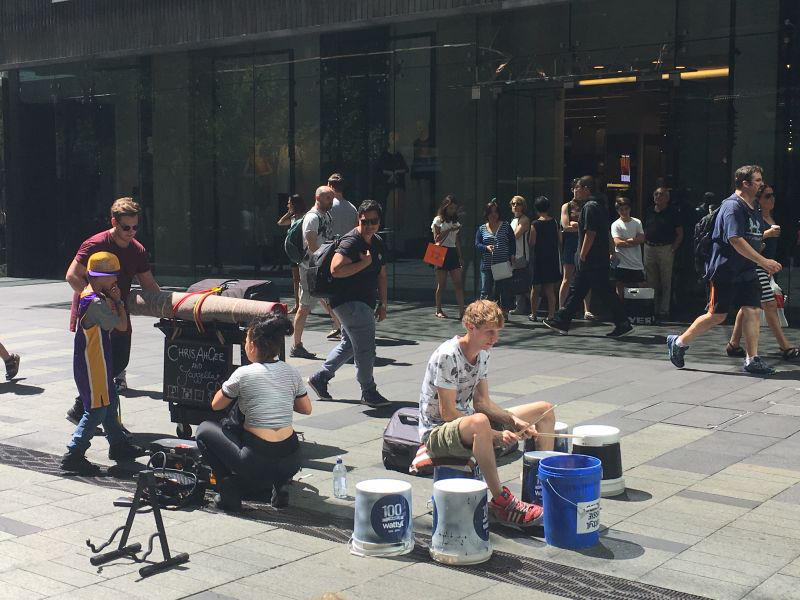 下午,师生们纷纷走向悉尼的街头,感受与记录悉尼街头的艺术文化。说到悉尼的步行街,第一个想到的一定是皮特商业步行街了。作为世界上商铺租金最贵的地方之一,这里的夏季每天有六万人流。新改建的皮特街充满诗意、简洁和优雅,虽然地处于繁华的闹市,但是却依然能让人感到平静。