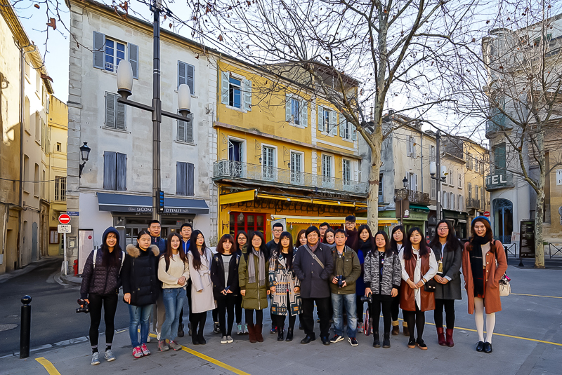 随后,访学团跟随马林老师穿过共和国广场来到梵高酒吧,并拍照留念。马老师向访学团介绍道:“阿尔勒是梵高当年生活的地方。当年他画画的酒吧以及精神病院现在还留存于此。当然,也正是由于梵高的出现,使得阿尔勒从此而美名远播”。