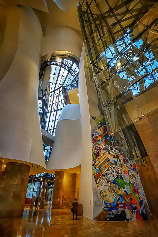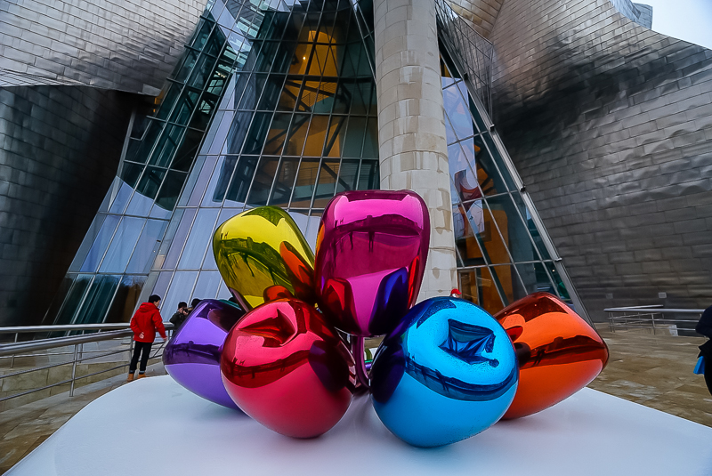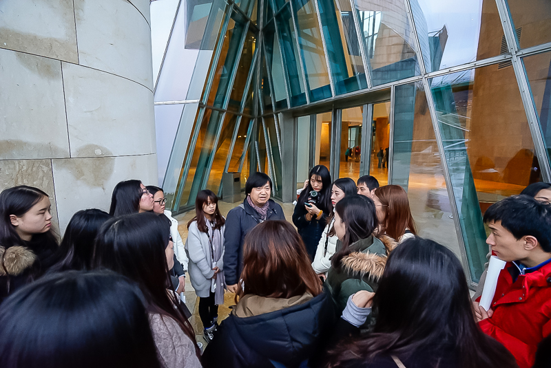 下午6点20分,访学团在细雨朦胧中抵达了毕尔巴鄂,并在马林老师的带领下前往参观古根海姆当代艺术馆。该艺术馆是由美国艺术家弗兰克·盖里设计,其中收藏着多件当代艺术珍品。如意大利超前卫主义、德国表现主义、美国波普艺术等风格流派的艺术品均在此有所收藏。马老师认为,在该艺术馆中,不能只看到馆藏的艺术品,而需了解当代艺术史与艺术流派的变迁。此外,他还提到:“上世纪六十年代开始,世界美术史的中心从欧洲转到了美洲,而美国渐渐掌握了世界艺术的话语权,并开始有意识的鼓励德国、意大利等国的不同艺术流派进行艺术创作。而中国或者其他国家,也出现了一批现代艺术家,但却并未形成流派,因而在世界美术史中能起到的影响也非常有限。”对此,他还表示:“年轻的一代具有更强的接受性与可塑性,也许能通过学习优秀的现代艺术作品来加强自身的艺术修养,来达到发展世界现代艺术的目的。”