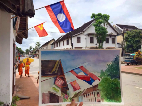 早饭后老师同学对昨日画作进行点评和交流,随后写生组同学们开始写生,傍晚的湄公河很美......