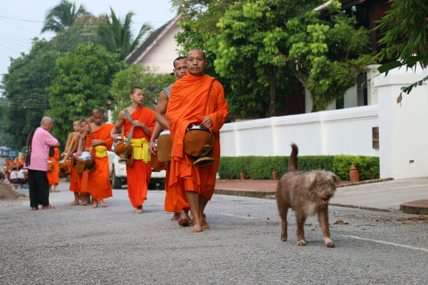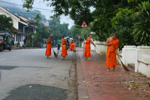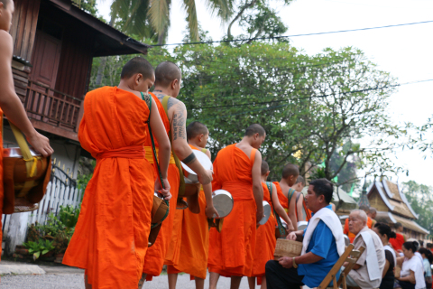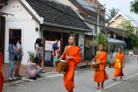 (摄影 王铭毓)九月七日清晨,同学们走在小城街巷感受琅勃拉邦传统布施。一列列身穿黄色袈裟的僧人赤足鱼贯着走上街头接受信众的布施。整个布施过程只有静静的脚步声。每一个人都平静而自然。在这个以小乘佛教为主的国家,人们的宗教生活和日常生活早就合二为一。布施结束,青年僧人装着化缘而来的煮好的黏米,以及一些饼、水果的布袋回到寺庙或一些老僧人先乘船到对岸,留少年僧人清扫街道。