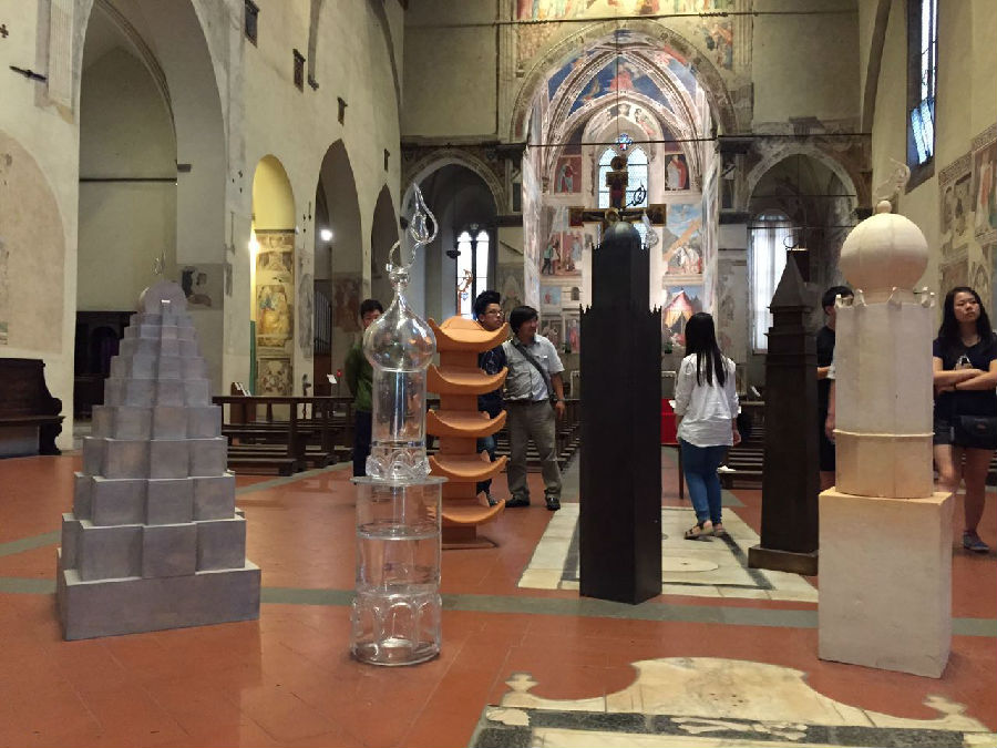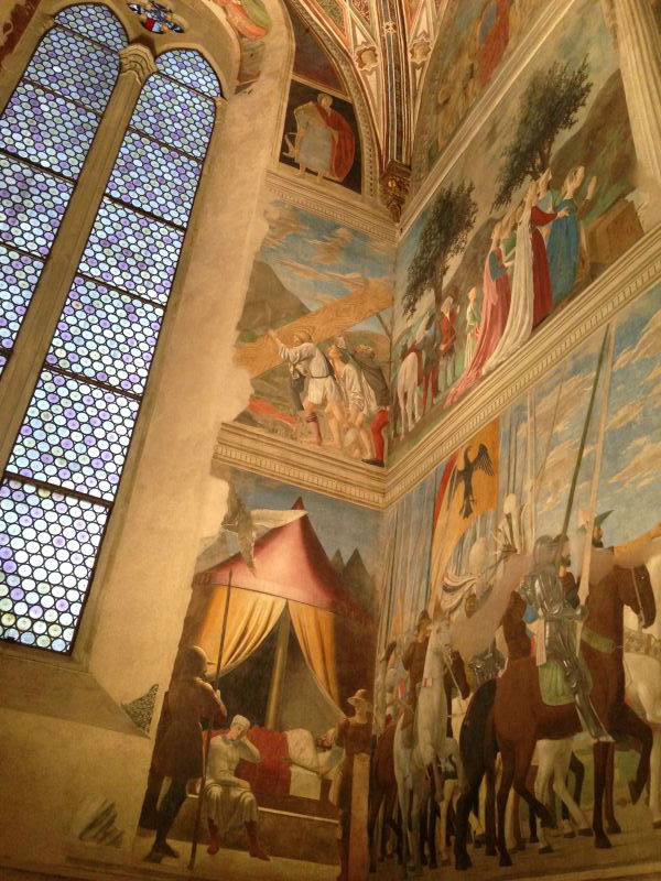 比罗德以科学的方式总结透视规律,写出了名著《论透视学》、《论色彩学》,在乔托的基础上将文艺复兴往前推进了一大步。教堂中庭正在展出的是英国当代艺术家的装置作品。每年在此举办一位艺术家的展览,以示其在专业上的造诣达到与文艺复兴大师相抗衡的高度。阿雷佐城市广场,有著名建筑师瓦萨里设计的拱廊,广场现在作为室外音乐会的场地。小组参观到此地时,正好在进行每年一度的赛马活动。