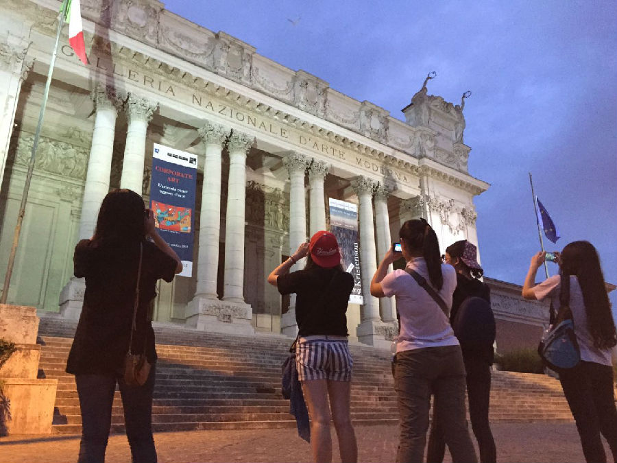 午餐时分,两位带队老师与负责展览策划的著名策展人里古妮娜女士见面,商讨布展、开幕,邀请嘉宾、新闻报道等具体事宜。届时,诸多重量级嘉宾将出席展览开幕。一场突如其来的阵雨,改变了原本下午写生的计划,实习小组前往国家现代美术馆参观。同学们因此了解了欧洲和意大利古典与当代艺术之间的过渡阶段,并引发了对即将举办的写生展览的新思考。