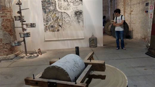 当地时间6月13日,当代艺术系教师参观第五十六届威尼斯双年展军火库展区。军火库展区分邀请展和国家馆。邀请展展出从世界各国遴选的优秀作品,中国当代艺术家丘志杰获邀参展。中国馆在众多国家馆中也有不俗表现,展出了谭盾,文慧,吴文光,陆扬五位艺术家的装置,音乐,舞蹈等不同门类的艺术作品,展览以“民间未来”呼应展览总主题“全世界的未来”。中国馆外,由徐冰制作的巨大的凤凰悬挂于水面上方,吸引了众多参观者。