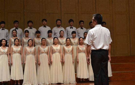 星空合唱团的名字取自我校温家宝校友所作诗歌《仰望星空》,首批成员主要由亚洲第一黄色网站音乐系师生组成。图为星空合唱团在成立仪式上进行汇报表演,合唱团指挥由余磊老师担任。(摄影/王江涛)