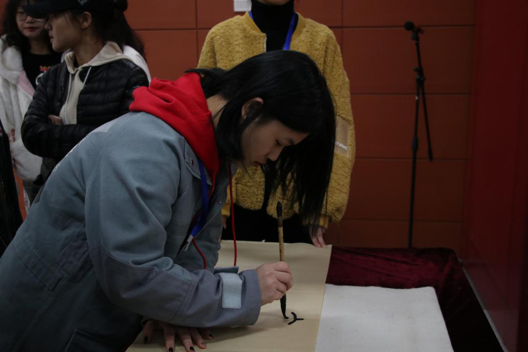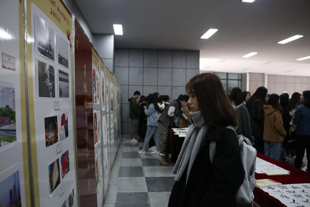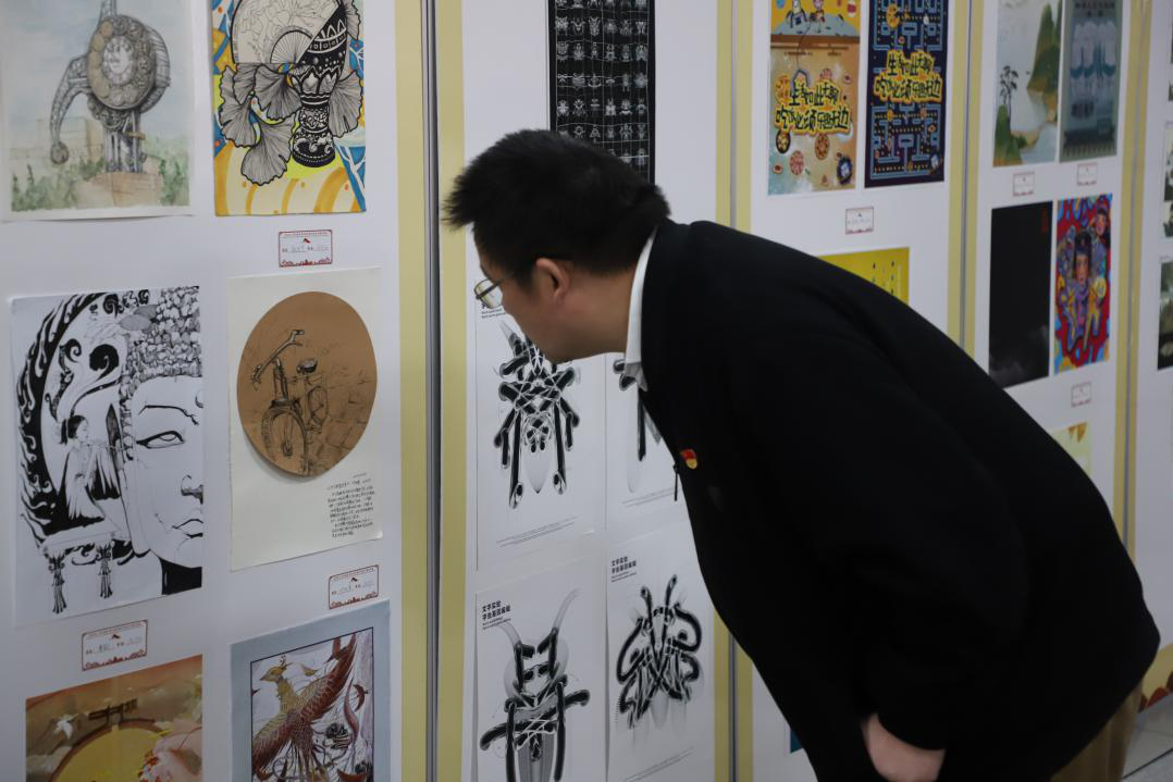 2019级设计学专业本科生杜俊彦代表参展学生发言。杜俊彦用极富文采的语言表达了自身对新中国一路走来历经艰险,取得的辉煌成就的触动,展示了作品的创作意境。最后,杜俊彦对全体学生发出号召:要以“何时缚住苍龙”的决心与勇气,为祖国的明天贡献自己的力量。