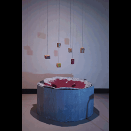 《沉没》: 作品的装置的粉末与流沙掉落并被细砂吞没,一起下沉,最终消失于漆黑的小洞里。历史终究不抵时间的漩涡