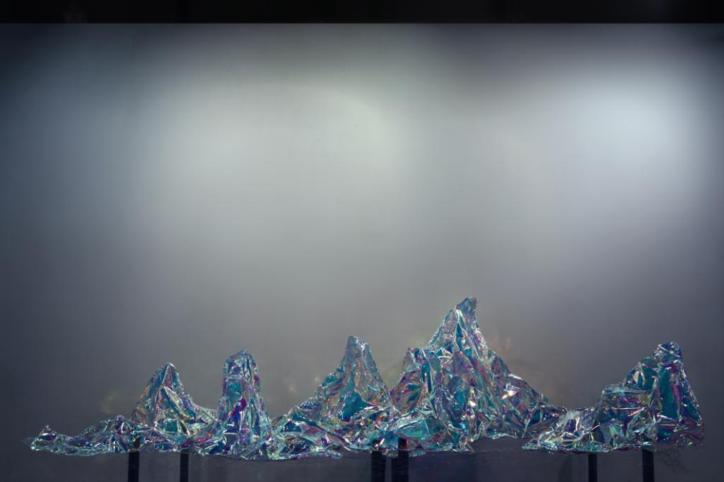《无形山》: 材质为透明的镭射纸,在光线下反射出绚烂的影像,致敬那未被文字记载却孕育了荆楚文明的上古时代。