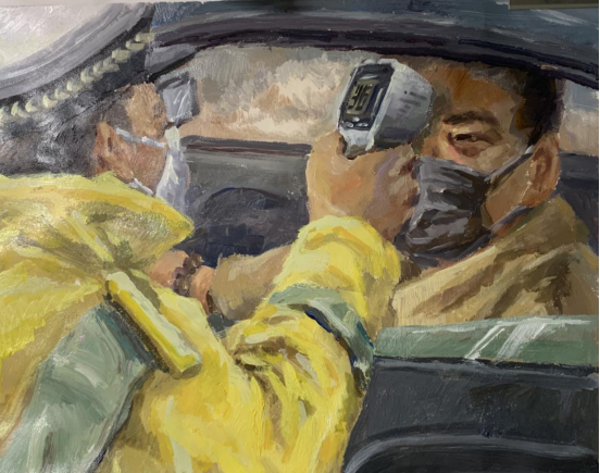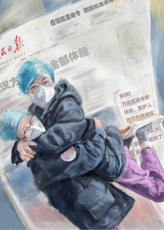 (作品说明:在当下抗击疫情的日子理,有这样一些人,舍小家、为大家,不顾个人安危,勇敢"逆行”。他们的精神深深感动了我,他们来自各行各业,有奋战在疫情一线的医院医生与护士,每天与病魔缠斗,被口罩勒红的伤痕是他们的勋章。加紧建造临时医院的工程人员,快马加鞭的为病人构筑生存的空间,还有一线民警,在关键时刻坚持上岗,维护社会秩序。这些是这群逆行者中的少部分人,但却是有代表性的人,因此我选取了他们的形象,代表这群最美逆行者,加以中国版图作为背景,寓意我们一定能合力齐心,战胜病魔!武汉加油,中国加油!)