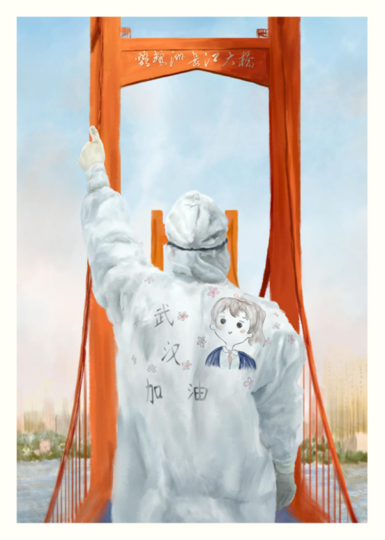 (设计说明:图片以医务工作者为前景,武汉长江大桥为背景构成一张海报。医生身穿防护服做出加油的手势,表现了自己必胜的决心,也代表着全国人民共同努力,共同抗疫的精神。背景选用长江大桥一是明确疫情最严重的地区在武汉,二是使用对称图形可使画面更加美观。)