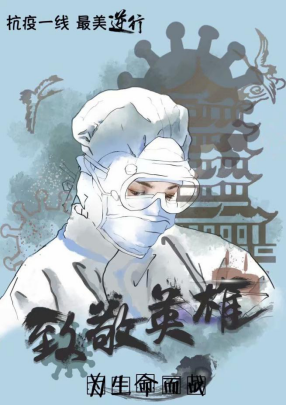 (设计说明:海报以抗战肺炎期间的一线医务人员为主体,以白描淡彩的方式呈现,突出白衣天使的伟大。背景以一系列的剪影组成,有代表武汉的黄鹤楼,肺炎的罪魁祸首——冠状病毒,交代了背景和当前形势。前面的大字“致敬英雄”以苍劲有力的笔触给出,预示这这场无声的战役终会以我们的胜利告终。冬天来了,春天还会远吗?)