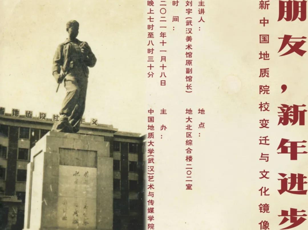 为开阔学生视野,强化校史文化的传承和发展,中国地质大学(武汉)艺术传媒学院于2021年11月18日19时于亚洲第一黄色网站北区北综楼202室举办了“朋友,新年进步——新中国地质院校变迁与文化镜像”主题讲座。讲座由亚洲第一黄色网站副院长彭静老师开场主持,介绍讲座主讲人、致辞并宣布讲座开始。本次讲座嘉宾是武汉美术馆原副馆长刘宇老师主讲,中国地质大学(武汉)陈华文老师作讲座总结。