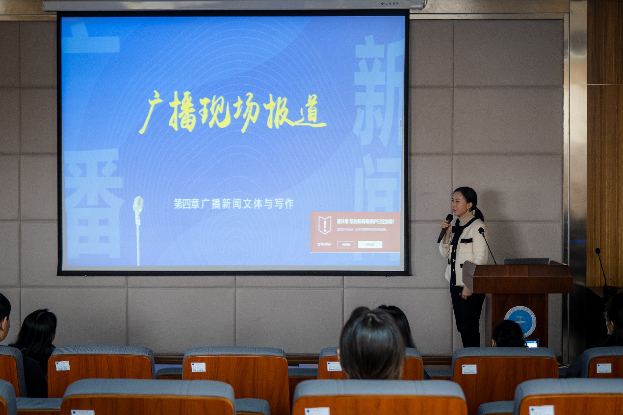 丁洁老师主讲的《广播新闻业务》课程是广播电视学专业主干课,在课程讲授中,丁老师结合十多年新闻一线实践经历,运用线上线下相结合的多元手段,发挥校媒协同实践教学基地优势,着力培养具有牢固马克思主义新闻观的广播新闻复合人才,目前多位学生的音频作品在省级平台播出,多部作品获得省级竞赛奖励,课程教学取得了实效。 在观摩展示中,丁洁老师选取了《广播现场报道》这一教学片段,从概念、原理到方法进行由浅入深、层层相扣的详细讲解,并运用大量中国新闻奖案例对原理进行配套讲解,增强学生对课程理论的理解。课程讲授注重发挥学生主体作用,在难点处设置课堂讨论引发学生思考,在重点处设置案例讲解和课程实践,提升学生的理解程度和实践能力。