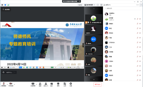 通讯员:李伟娜 摄影:刘定耀 周华)4月14日下午两点半,学院党委理论学习中心组在学院1209会议室开展集中学习师德师风专题内容,学院领导班子全体成员及三级单位负责人在学院1209会议室参加现场培训,其他教职工通过腾讯会议线上聆听。会议邀请了校学术委员会道德分委会副主任宁伏龙教授做专题讲座,本次大会由学院党委书记郭秀蓉主持。