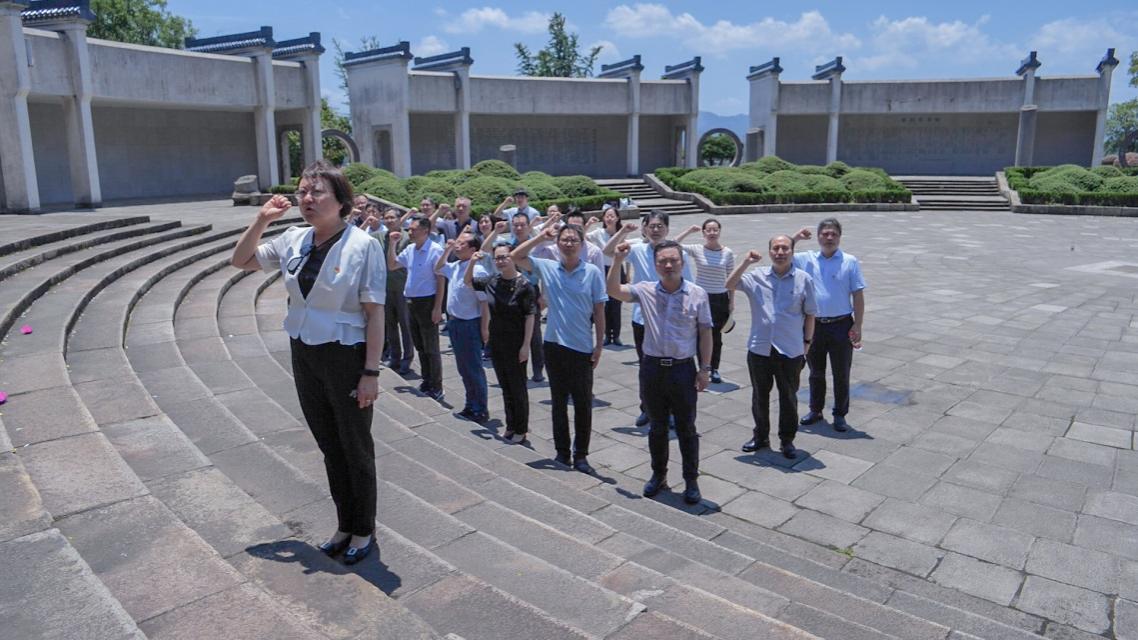 实践研学活动的最后一站是全体拜谒皖南事变烈士陵园。走进陵园,大家拾级而上,到达主碑纪念广场。在邓小平题写的“皖南事变死难烈士永垂不朽”纪念碑前,全体成员举行了庄严肃穆的敬献花篮仪式,全体成员三鞠躬,向烈士致以崇高的敬意。全体参会党员在纪念碑前举起右手,重温了入党誓词。之后,园区讲解员向大家介绍了纪念广场建筑的象征寓意,带领大家参观了无名烈士墓和名人题字碑廊。