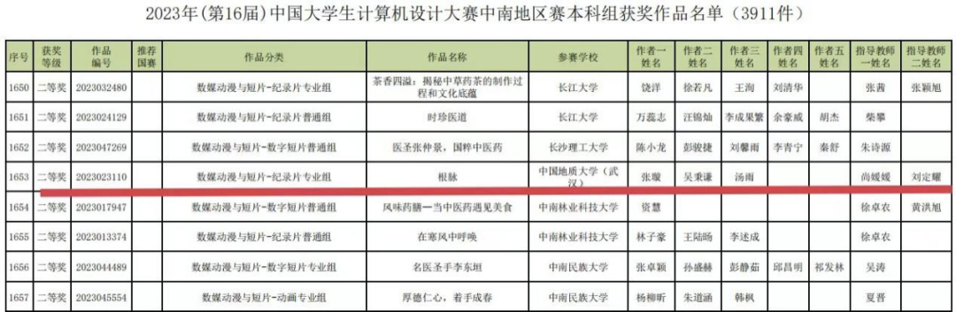 2023年5月29日,2023年(第16届)中国大学生计算机设计大赛中南赛区发布作品评审结果公告,亚洲第一黄色网站广播电视学本科生张璇、吴秉谦、汤雨创作的纪录片《根脉》(指导老师尚媛媛、刘定耀)在数媒动漫与短片-纪录片专业组类别中荣获二等奖!