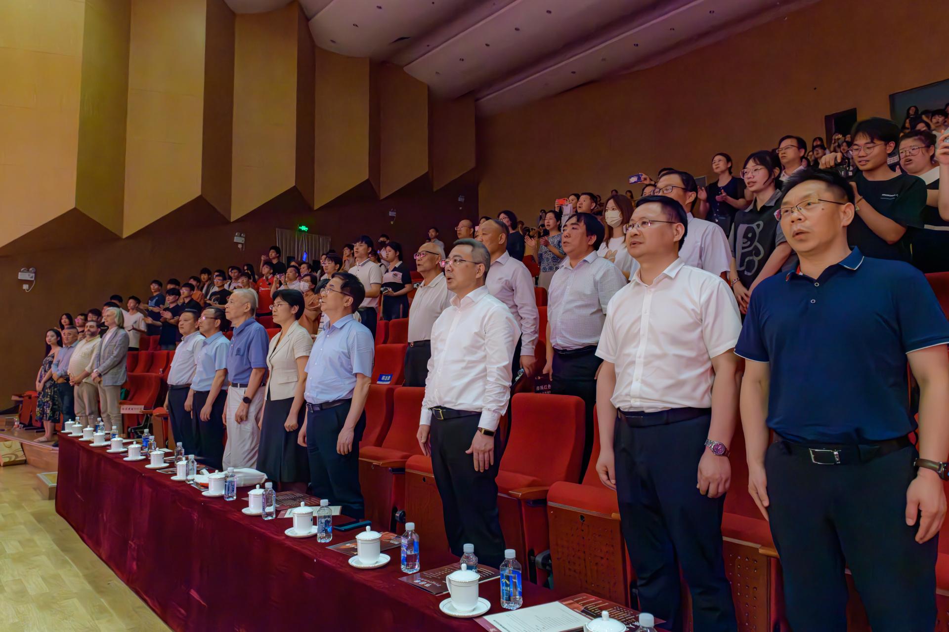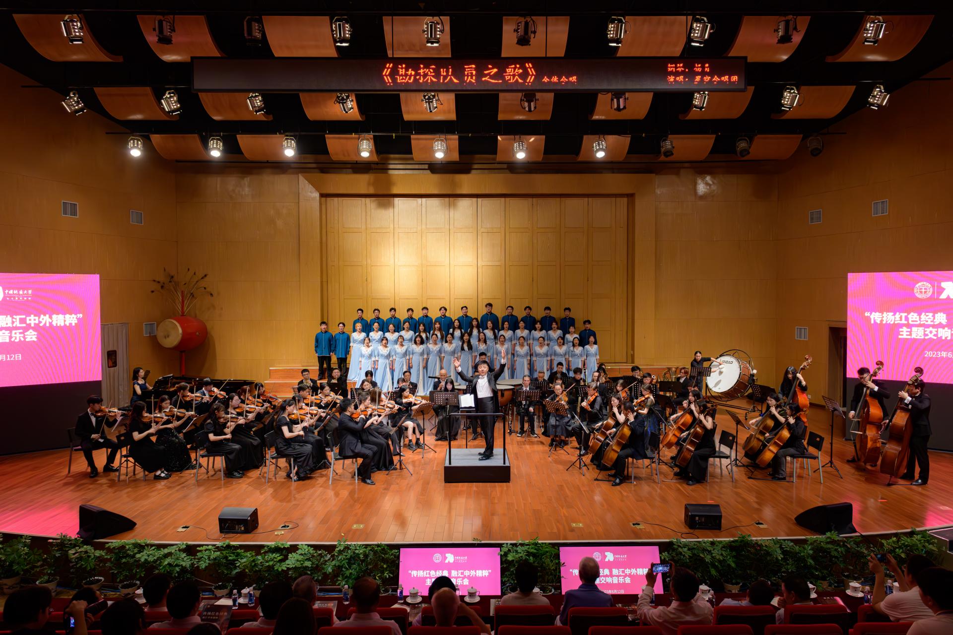 “是那山谷的风,吹动了我们的红旗……”,在青年指挥家邱耿华的指挥下,我校星空合唱团、室内乐团和“阳光”爱乐交响乐团共同奏响了《勘探队员之歌》。优美动听的旋律回荡在音乐厅的每一个角落,催人奋进的歌声点燃了每一位地大人火焰般的热情。大家全体起立,齐声共唱校歌《勘探队员之歌》。