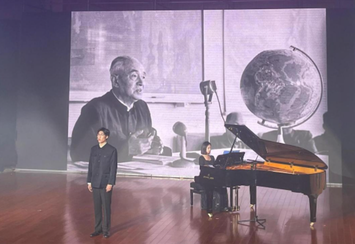 中国地质大学新闻传播学硕士王琼逸代表学生发言,同为中国地质大学学生的吴恺文(讲述人)、王艺璇(钢琴伴奏)现场表演了配乐朗诵《大地之光》。