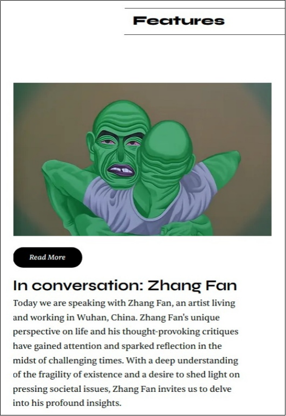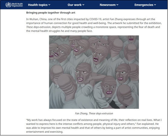 近日,世界卫生组织西太平洋区办事处(World Health Organization | Regional Office for the Western Pacific)官方网站在题为“Using art to inspire positive change for future health in the Western Pacific”的专题报道中刊发了我院张帆副教授的访谈及作品。2022年,张帆副教授作为唯一一位来自中国的艺术家参与了世卫组织西太平洋区办事处的艺术项目“WHO Futures Art Exhibition”,作为该艺术项目的组成部分,世卫组织西太平洋区办事处对张帆副教授进行了专访并于近日在专题报道中刊发了部分访谈内容。专访中张帆副教授与对方探讨了艺术家的创作;“COVID-19”对世界及人类社会的影响;如何改善解决生态环境问题;艺术对创建健康未来社会的作用以及疫情影响下艺术家个人生活状态等议题。张帆副教授的作品曾在多个国家展出并发表收录于多部国际艺术出版物,近年来欧洲多个国家的艺术杂志及网站也相继对张帆副教授进行了专访并全文刊发了访谈内容及部分作品。