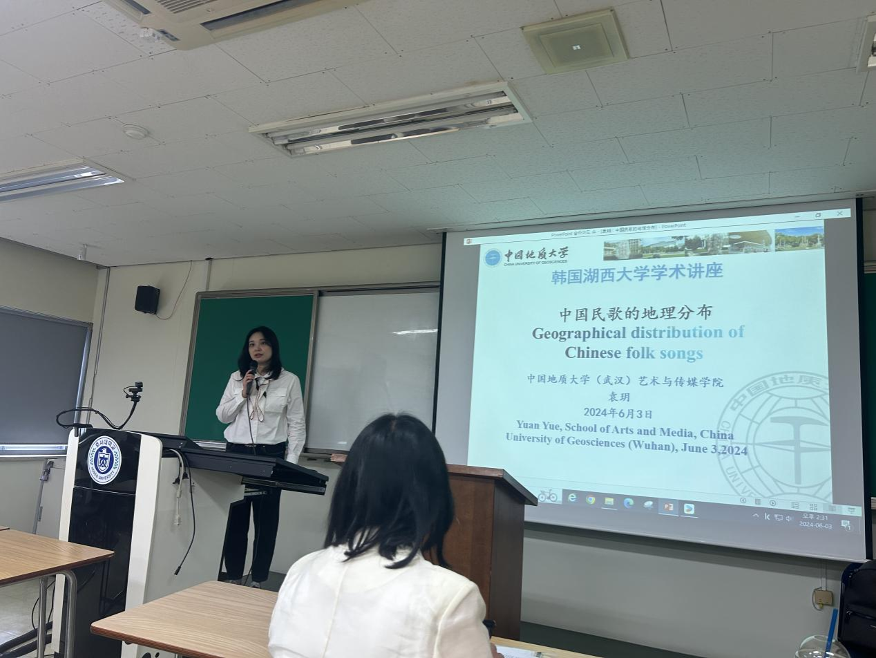 袁玥副教授为湖西大学音乐系博士生和硕士生做了一场题为《中国民歌的地理分布》的学术讲座。讲座中,袁老师通过现场演绎、音视频等方式绘声绘色地讲解了中国民歌的地理分布和特点,与同为音乐专业的师生们产生共鸣,看到听到熟悉的曲调,和袁教授一起哼唱,现场气氛热烈。期间,袁玥等一行与中国留学生一起进入音乐厅,现场观看李涵娜教授的课堂教学,并与李教授讨论音乐的相关问题,开展学术交流。