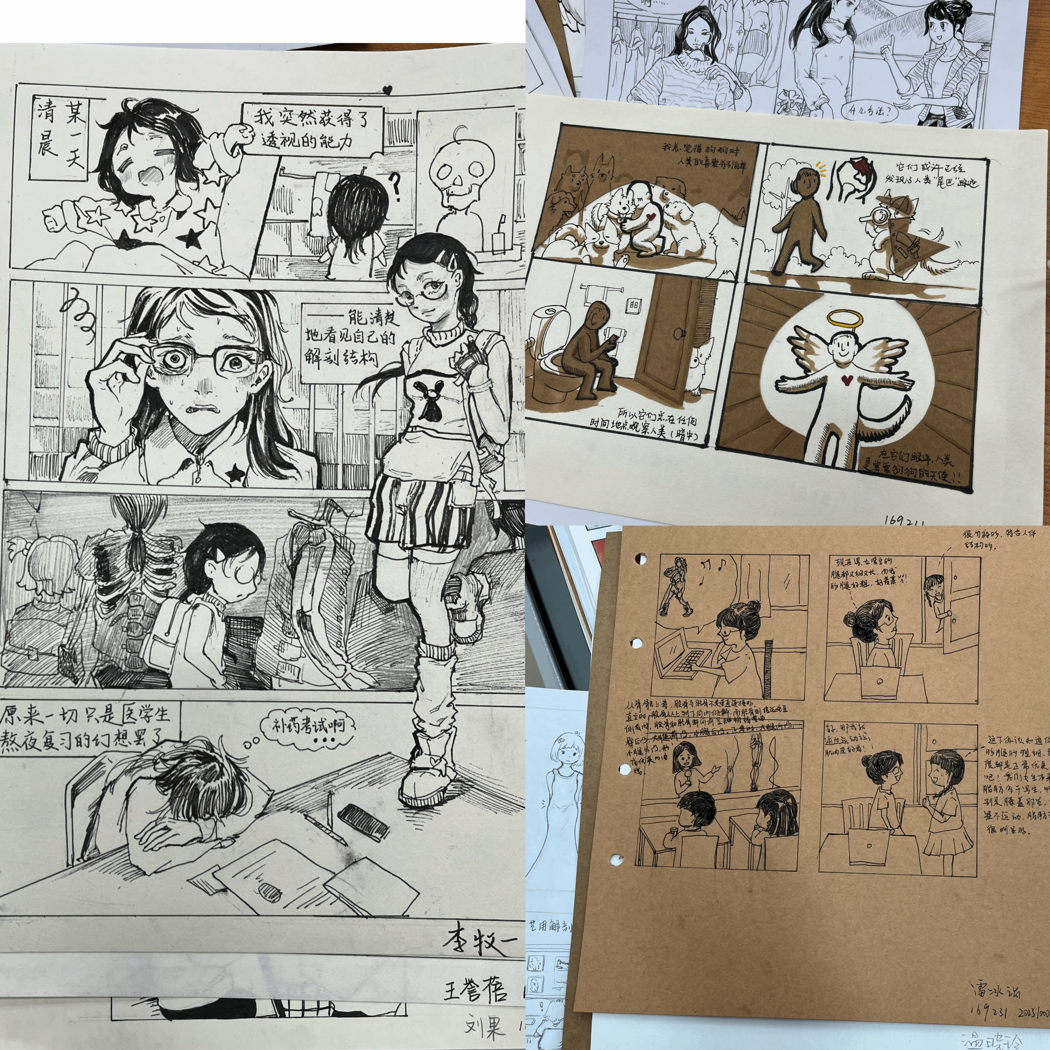 四格漫画里,学生们妙笔生花,用漫画捕捉人体结构,艺用解剖学知识融入四格,趣味横生。通过细致的描绘,展现出人体骨骼和肌肉的结构与动态。四格漫画以生动有趣的构思,将艺用解剖学的知识以轻松的方式传达给观众。展览展示了多本关于艺用解剖学的手工书,这些手工书由各位学生制作,涵盖了艺用解剖学的多个方面。通过课程学习,同学们在手工书中介绍人体骨骼、肌肉、器官等基础知识,通过手绘插图和详细标注,让读者更直观地了解人体结构。