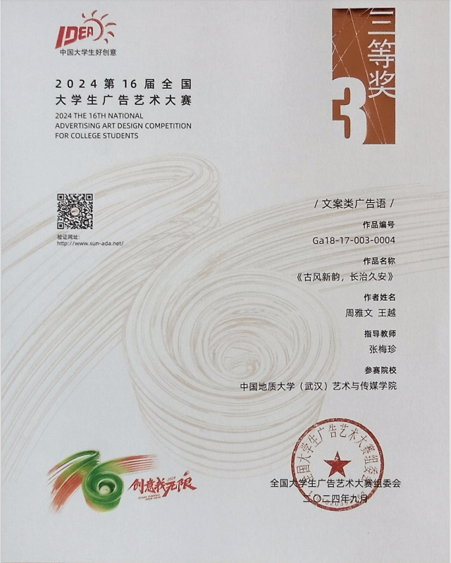 本次大赛,由张梅珍老师指导, 周雅文、王越制作的 文案类广告《古风新韵,长治久安》,荣获全国三等奖。