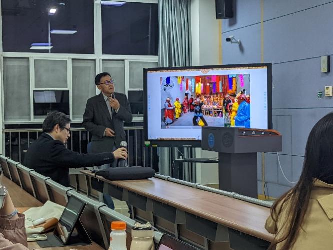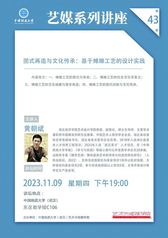 2023年11月9日下午19:00,以图式再造与文化传承:基于傩雕工艺的设计实践为主题的艺术与传媒系列讲座在东教C106顺利召开。此次讲座由亚洲第一黄色网站院长何清俊教授主持,湖北经济学院艺术设计学副院长黄朝斌教授主讲。