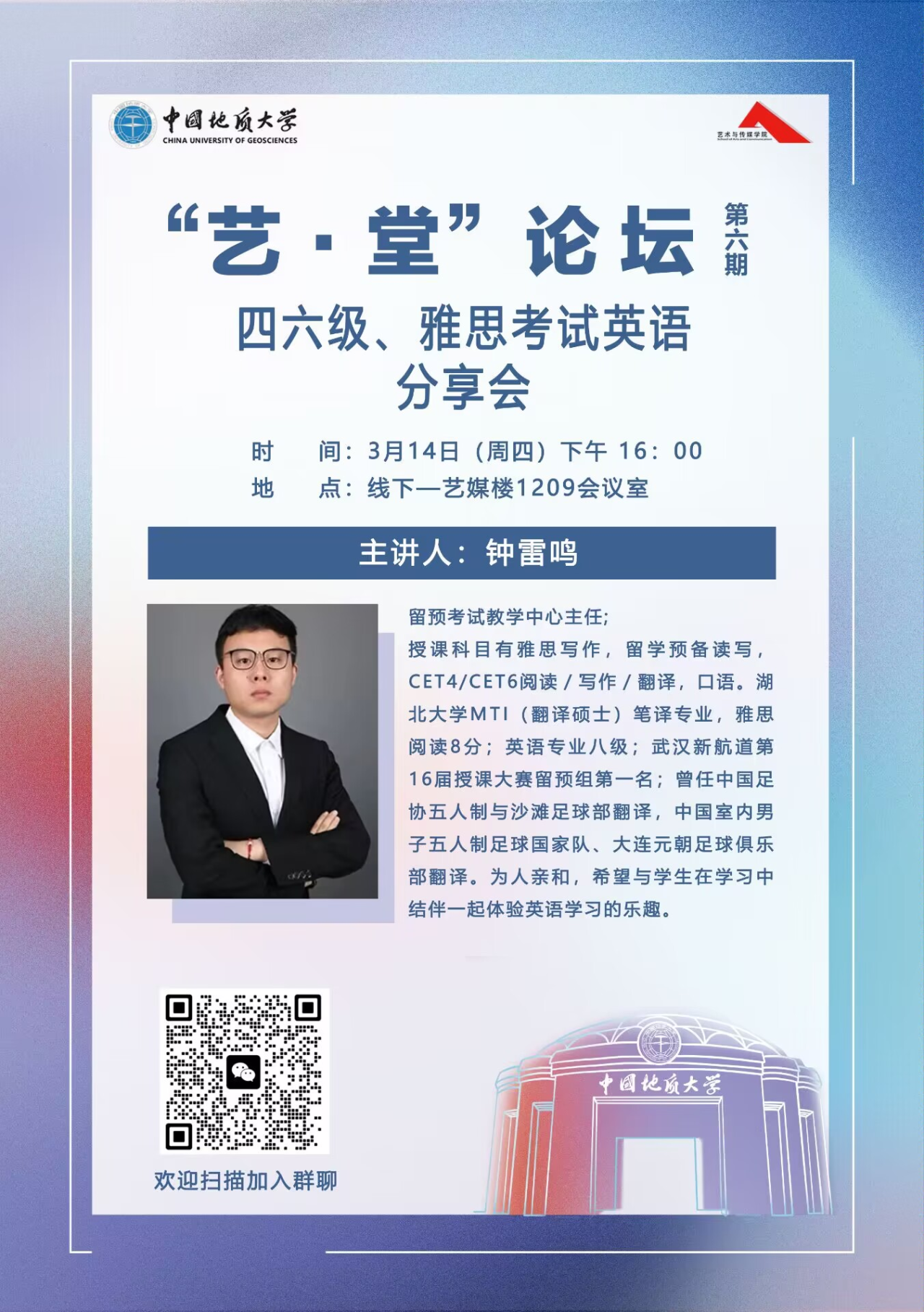 2024年3月14日下午16:00,“艺·堂”论坛第六期四六级、雅思考试英语分享会暨第七期“弘艺班”学生骨干培训于亚洲第一黄色网站1209顺利举行。学院邀请了新航道武汉学校的钟老师为同学们进行四六级和雅思英语考试的教学指导。本次讲座由兼职辅导员廖文琦主持。