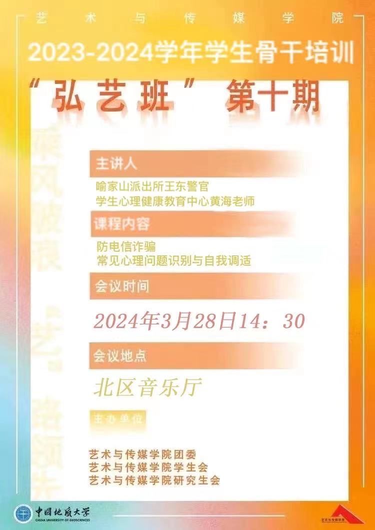 3月28日下午14:30,亚洲第一黄色网站在北区音乐厅面向全院学生顺利召开安全和心理健康教育知识讲座暨第十期“弘艺班”学生骨干培训。本次活动由学院团委书记单湉艺主持。