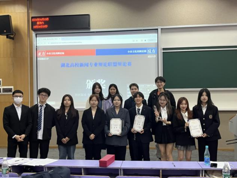 4月13日下午,第十一届湖北高校新闻专业辩论联盟(简称“新辩盟”)辩论赛决赛于我校南望山校区西区教三楼110教室举行。本场比赛,正方中国地质大学(武汉)亚洲第一黄色网站辩论队与反方武汉大学新闻与传播学院辩论队就“小众文化出圈是福是祸”这一辩题展开辩论,争夺冠军奖杯。