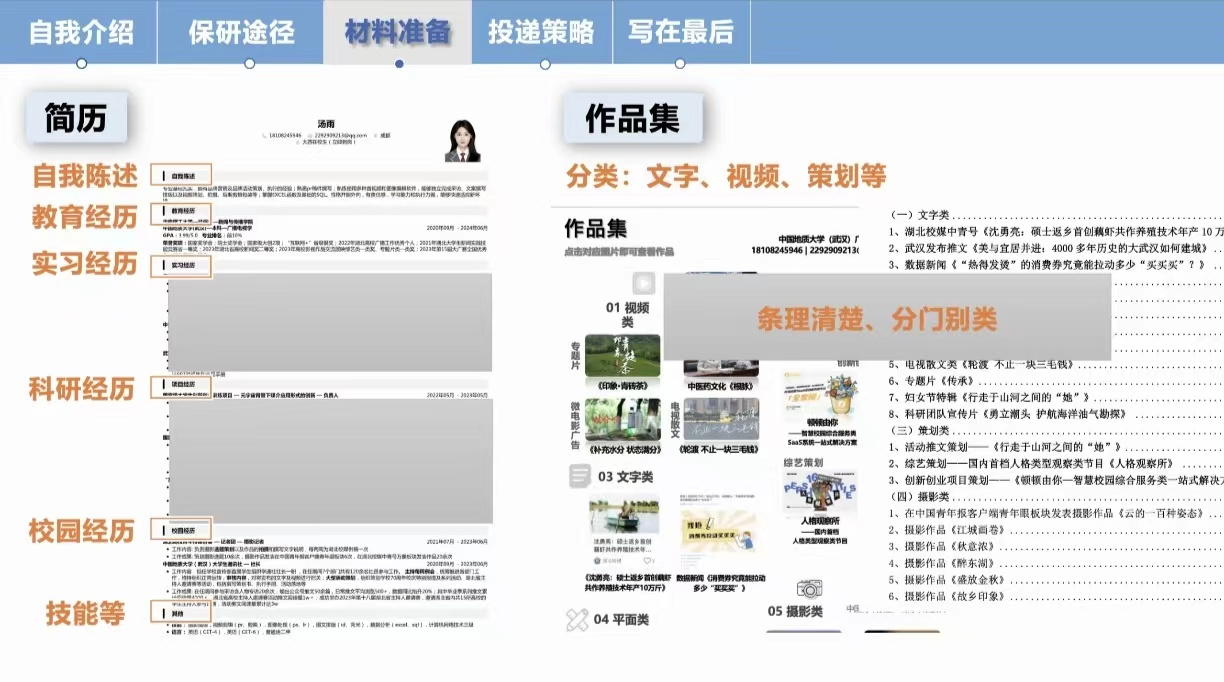 首先,广播电视学专业的汤雨同学从保研材料准备和选择学校等方面为同学们展开分享,详细介绍保研材料如何准备,着重分享了简历和作品集的小技巧。