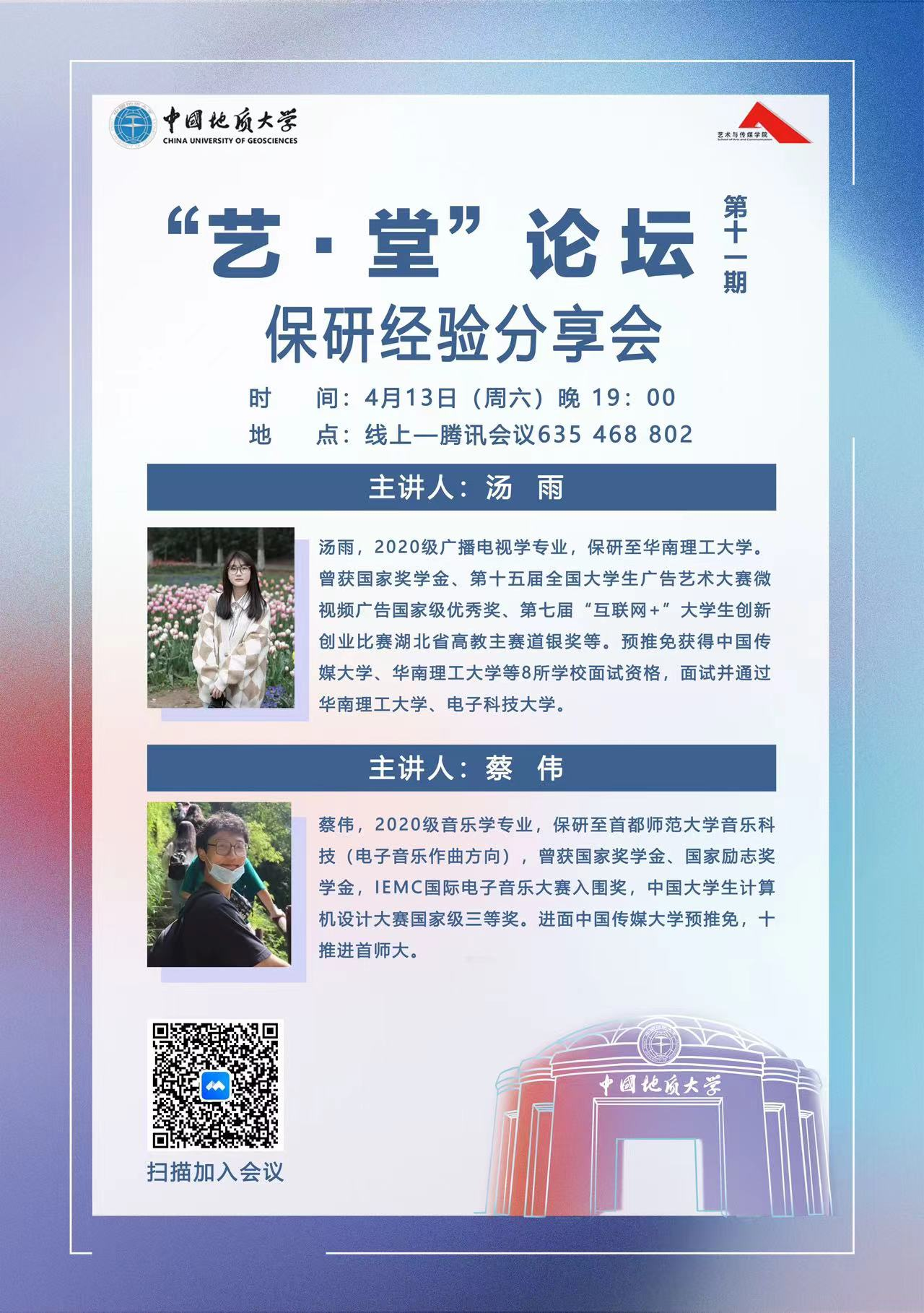 2024年4月13日晚上19:00,“艺·堂”论坛第十一期保研经验分享会顺利举行。学院邀请了2020级本科生汤雨和蔡伟为同学们进行保研经验分享。本次讲座由兼职辅导员廖文琦主持。