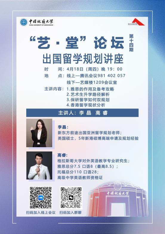 2024年4月18日晚上19:00,“艺·堂”论坛第十四期出国留学经验分享会顺利举行。学院邀请了新东方前途出国亚洲留学规划的李晶老师、高睿老师为同学们进行出国留学规划讲座。本次讲座由兼职辅导员徐雯茜主持。