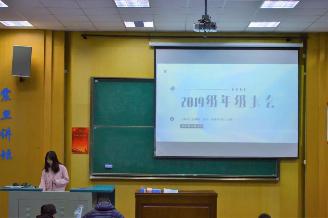 2021年12月23日晚上七点,亚洲第一黄色网站2019级年级大会于教三楼111准时召开,会议由2019级本科生兼职辅导员肖淋译主持,亚洲第一黄色网站党委副书记边建华、研究生会主席余跃及2019级全体学生参加。