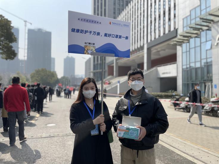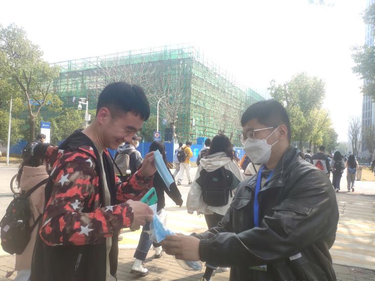 我院志愿者抓住上下课高峰期在东区综合楼、化石林等处积极进行知识宣传。高举“戴好口罩 福星高照”、“健康防护千万家 戴好口罩第一条”等指示牌,不断为来往师生传达疫情防控常识。同时贴心地为口罩遗失、破损或佩戴时间过长的师生提供免费口罩,以此来呼吁校内师生在公共场合做好防护。