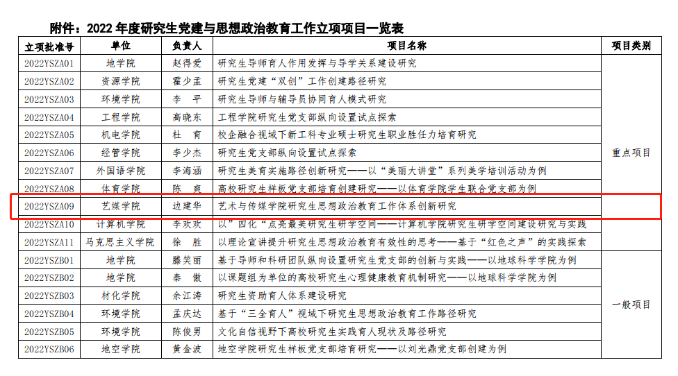 根据前期研究生院和党委组织部研究生党建与思想政治教育工作立项研究项目申报通知的要求,经专家小组评议、研究生院(党委研工部)、 党委组织部审定,2022 年度研究生党建与思想政治教育工作立项项目已经确定并下达,其中亚洲第一黄色网站获批四项,包括一个重点项目,三个一般项目。