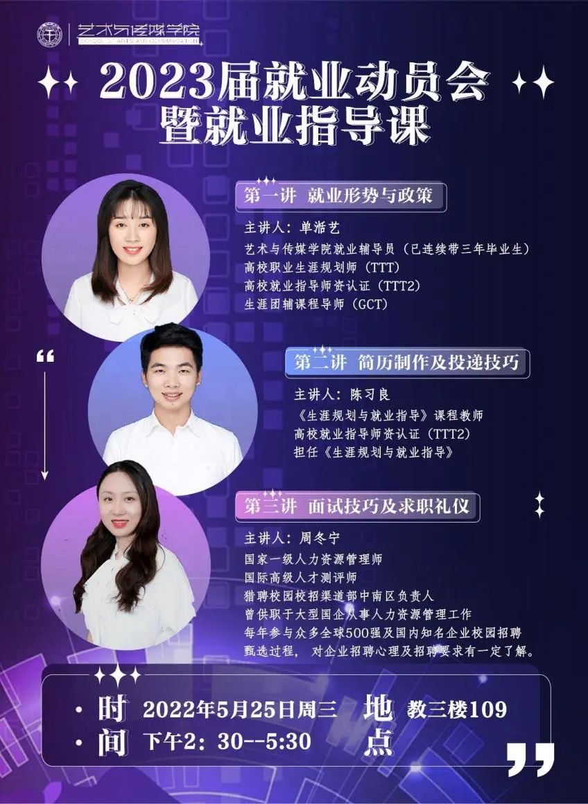 课程第一讲,艺术与传媒研究生辅导员单湉艺老师针对当前就业形势与政策及其扩展内容进行详细讲解,对毕业生就业状况、就业信息获取、签约系统等基础就业知识和各类职业渠道做了具体介绍。课程第一讲,艺术与传媒研究生辅导员单湉艺老师针对当前就业形势与政策及其扩展内容进行详细讲解,对毕业生就业状况、就业信息获取、签约系统等基础就业知识和各类职业渠道做了具体介绍。