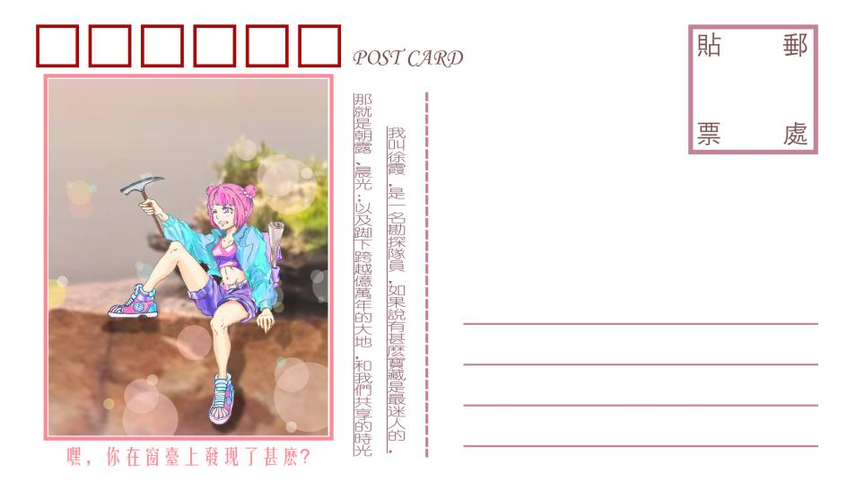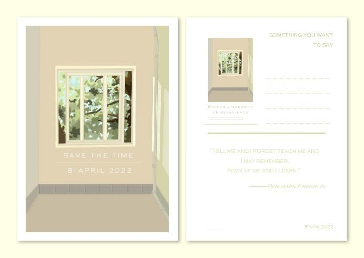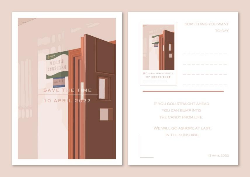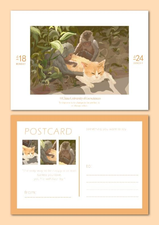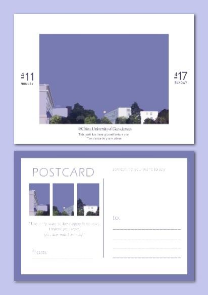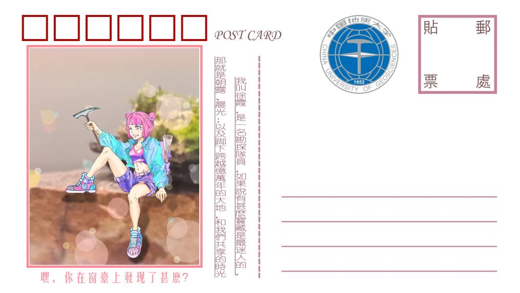 此明信片运用了中国地质大学校园生活景观、勘探队员形象等元素,创造出了一个活泼可爱的小精灵“徐”霞。在作者的笔下,徐霞活泼开朗,热爱生活,充满朝气,这不就是同学们的写照吗?