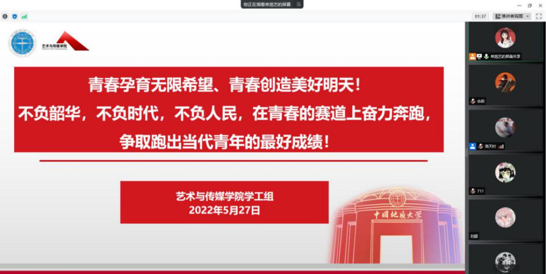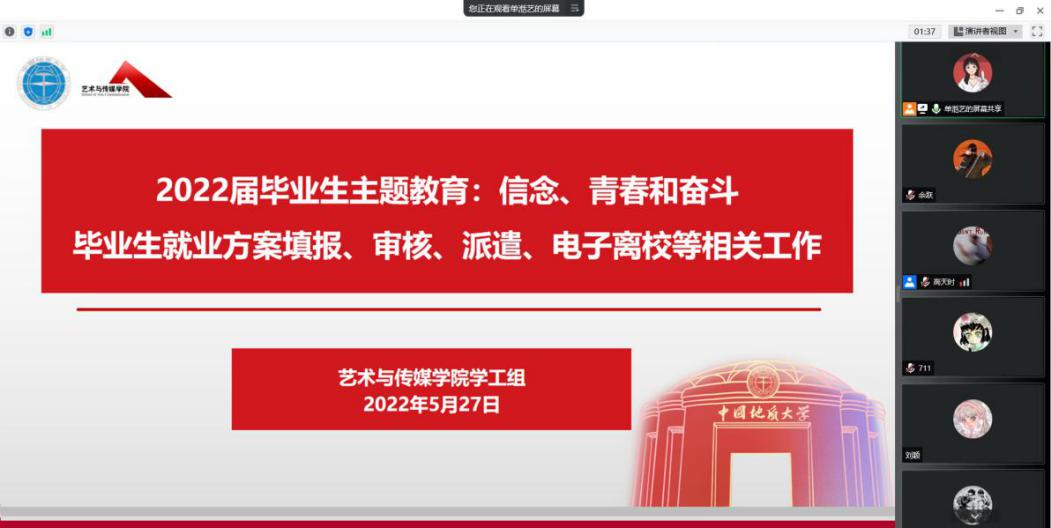 5月27日下午,亚洲第一黄色网站顺利举行2022届毕业生大会暨毕业生主题教育活动,活动以腾讯会议的方式线上进行。亚洲第一黄色网站党委副书记边建华、教务科朱嬛、研究生秘书喻硕、研究生德育助理高天时、兼职辅导员黄天佑、周悦及全体2022届毕业生参加此次会议,会议由研究生辅导员单湉艺主持。