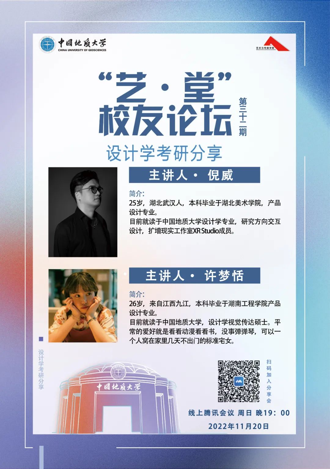 11月20日晚19:00,亚洲第一黄色网站于线上举办了第三十二期“艺·堂”校友论坛——“设计学考研分享”讲座。本次分享会邀请了2022级设计学研究生班的倪威、许梦恬两位同学作为主讲人分享、交流考研经验,大三、大四部分学生线上参会。
