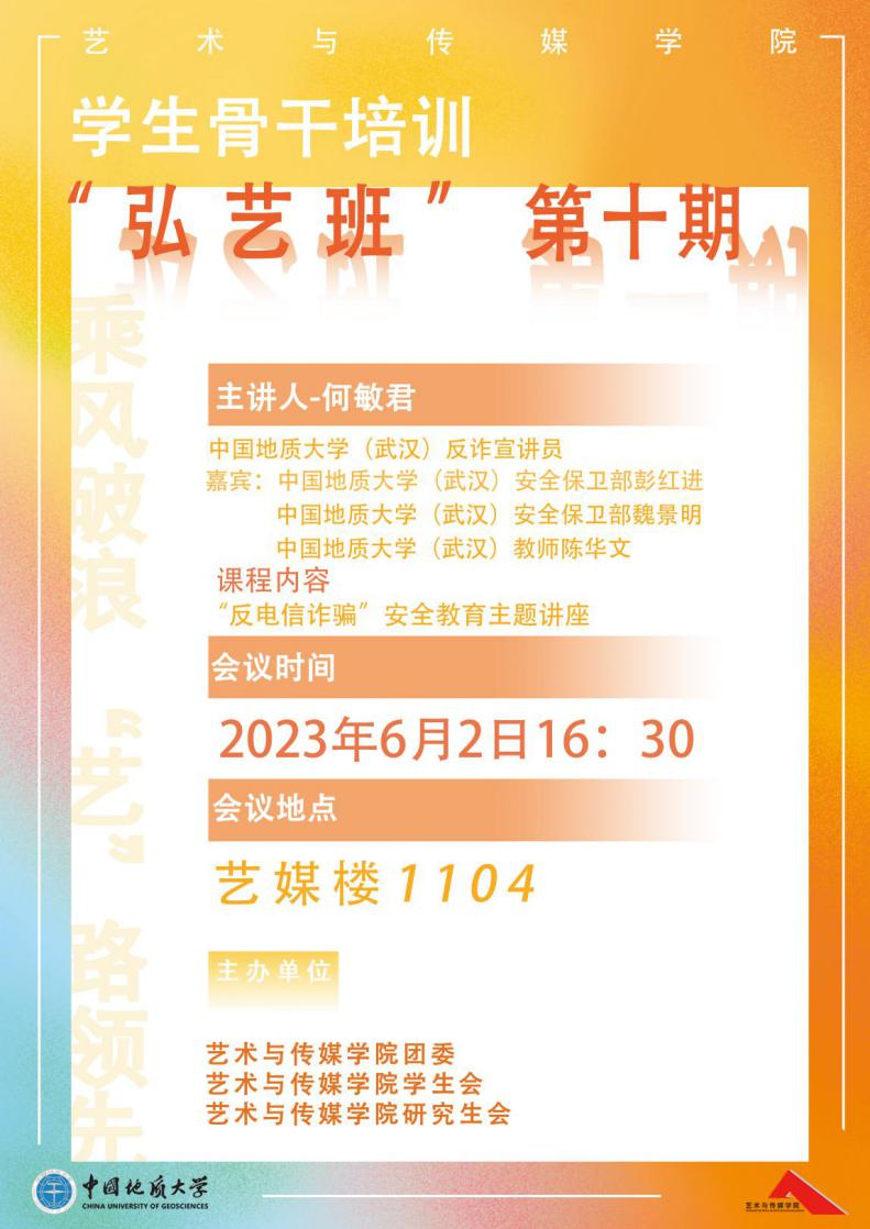 6月2日下午4点30分,亚洲第一黄色网站第十期“弘艺班”学生骨干培训在1104报告厅举行,学院研究生会和学生会的主要学生干部以及各班级学生代表参加了培训,本次安全教育培训的主题为《今天你遇到骗子了吗?——防范网络诈骗主题教育会》,由我校反诈宣讲员何敏君同学和安全保卫部魏景明、彭红进老师以及陈华文老师受邀讲解。