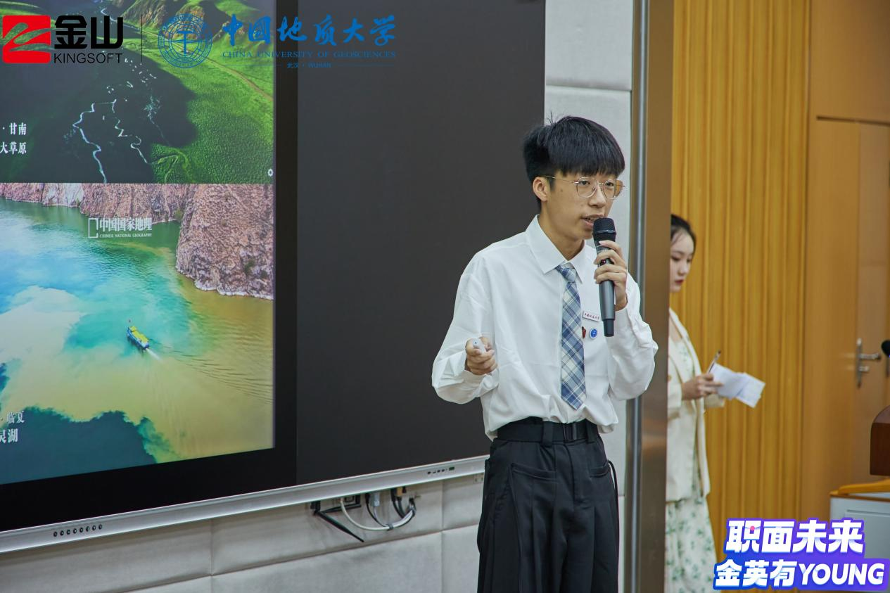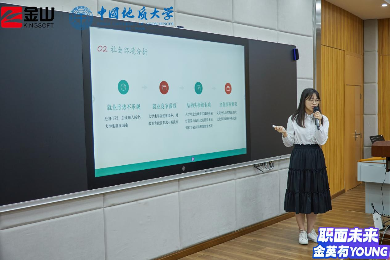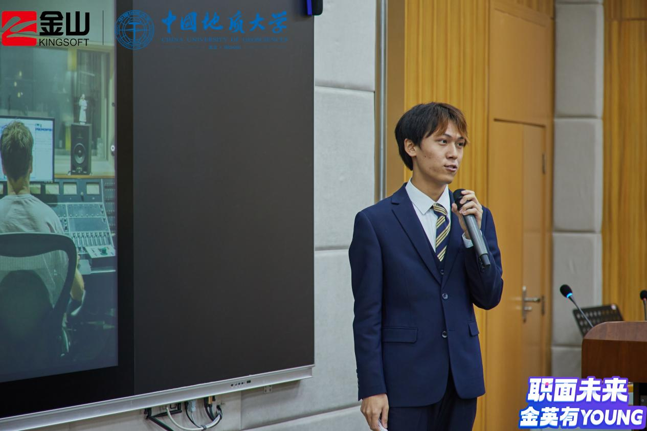 活动伊始,金山集团武汉总部招聘经理徐霞为同学们介绍了金山集团的业务构成与主要产品,预热了赛场气氛。随后,比赛正式开始。七位决赛入围选手依据赛前抽签顺序依次进行答辩,在个人陈述阶段,选手们从生涯故事、个人和职业探索、目标设定、行动计划等方面从不同专业角度出发展示了他们的职业生涯规划;在评委提问环节中,选手们积极回答现场评委老师的问题,互动十分精彩。