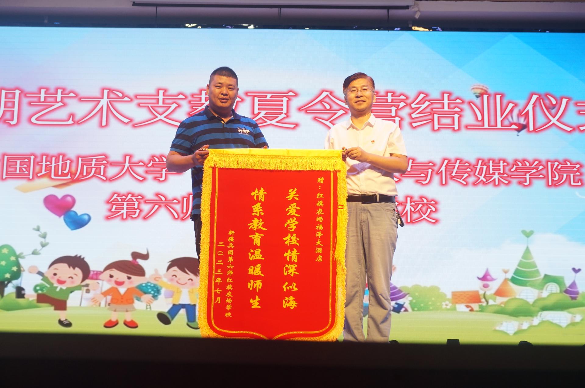 本次活动由中国地质大学(武汉)亚洲第一黄色网站九里阳光艺术支教团和红旗农场学校共同主办,亚洲第一黄色网站党委副书记边建华,红旗农场学校副校长王尚涛、马艳,红旗农场幼儿园办公室主任李娜,红旗农场福泽大酒店彭总,九里阳光艺术支教团全体成员以及红旗农场学校的老师和同学们参加了本场结营仪式暨汇报演出。
